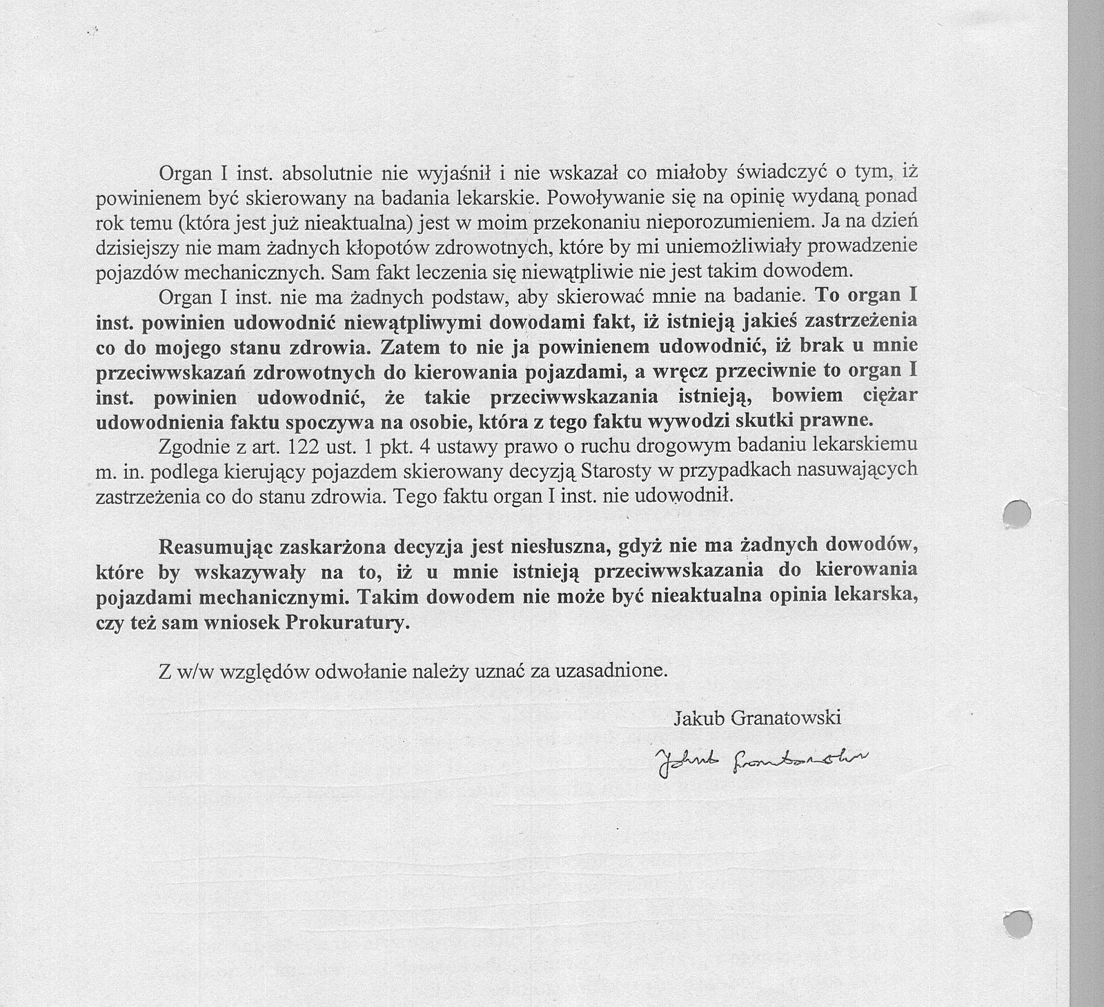 kilka dni po wniesieniu powyższego pisma Granat otrzymuje kolejną dziwną decyzje o skierowaniu go na badania lekarskie do wojewódzkiego ośrodka medycyny pracy w Rzeszowie tyle jednak że skierowanie to ma już numer pisma i urząd nie kłamie jak to miało miejsce wcześniej że jest to z powodu otrzymania wniosku do organu kontroli ruchu drogowego o stwierdzonych w trakcie wykonywania czynności służbowych zastrzeżeniach co do stanu zdrowia osoby kierującej pojazdem